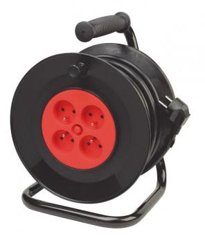 4 prises avec sécurité enfants. Enrouleur robuste en métal peint noir. Coupe-circuit thermique en cas de surchauffe. (bouton de remise en marche)