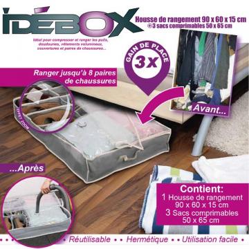 Cette housse de rangement sous vide a été spécialement conçue pour se ranger sous un lit. Elle vous permet de gagner 75% de volume de rangements grâce à l'aspiration de votre aspirateur. Un compartiment spécial est prevu pour ranger jusqu'a 8 paires chaussures. Livrée avec 3 sacs comprimables de 50 x 65 cm Très pratique pour les couettes, chaussures, couvertures, déménagement ou tout simplement pour récupérer de la place dans vos armoires. Le linge est protégé des odeurs, de l'humidité, de la poussière et des acariens. Avec une poignée de chaque coté, un grammage épais et un zip de fermeture en métal !