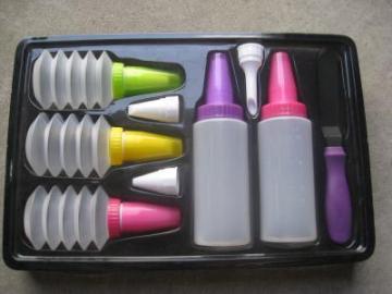 Décorer ses gateaux c'est facile avec ce kit comprenant : 3 flacons compressibles 2 bouteilles souples 8 douilles dont un embout spécial pour garnir le coeur des gâteaux. 1 mini spatule.