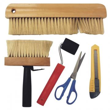 1 brosse de tapissier (pour maroufler) 32 cm. 1 brosse à encoller . 1 roulette de tapissier. 1 cutter. 1 ciseau.