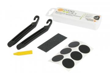 2 démonte pneus. 6 rustines rondes auto adhésives. 1 feuille de papier verre. 1 crayon gras spécial.