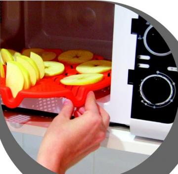 Il est également très simple d'utilisation : il vous suffit de trancher les fruits et légumes à l'aide d'une mandoline, de déposer les lamelles sur le plateau en silicone, puis de passer le tout rapidement au micro-ondes (entre 3 et 5 minutes)...